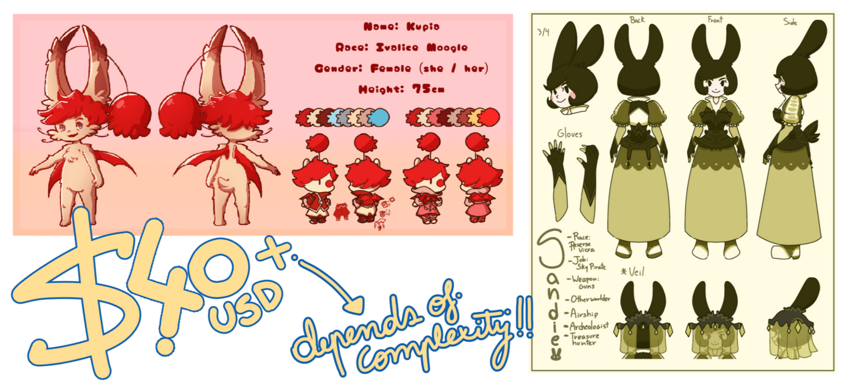 Character Sheets are made using the references, information and details provided by the commissioner. But also, using a custom chart that the commissioner can choose.